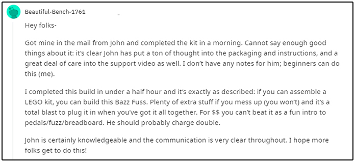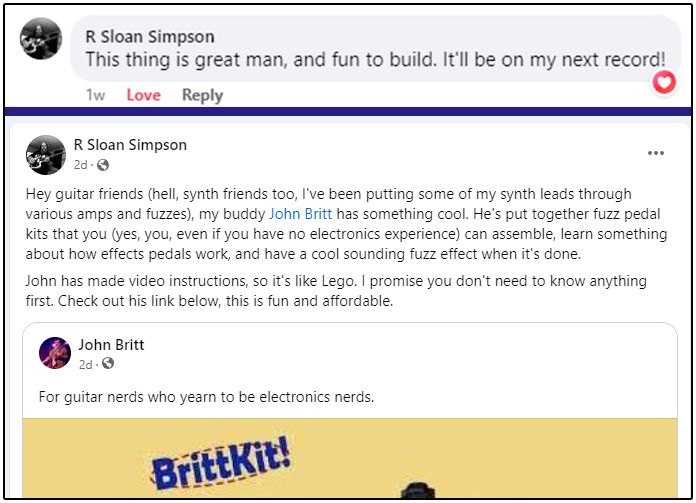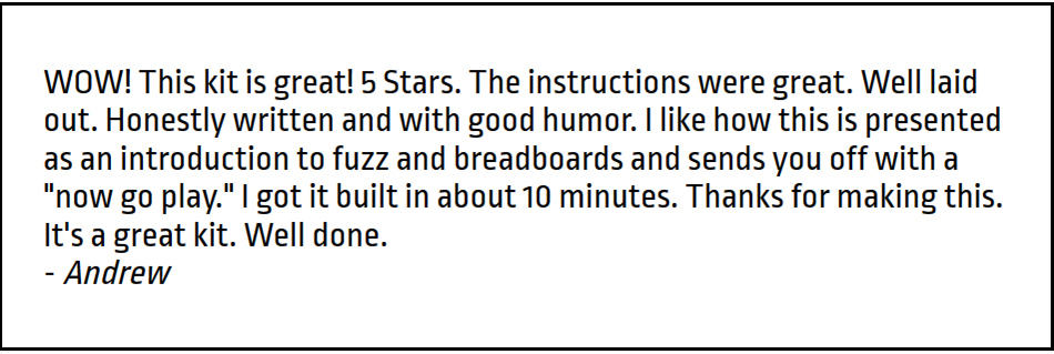 The BrittKit Beginner's Fuzz Kit is the solderless, easy-to-assemble gateway to your next obsession: making your own awesome guitar pedals. Regardless of your rock star status, no matter how much maker experience you have, you can do this! No electronics knowledge needed, no additional tools required. (9v battery not included)